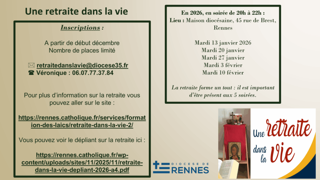 Voici les 2 liens pour voir la retraite et le depliant https://rennes.catholique.fr/services/formation-des-laics/retraite-dans-la-vie-2/ https://rennes.catholique.fr/wp-content/uploads/sites/11/2025/11/retraite-dans-la-vie-depliant-2026-a4.pdf